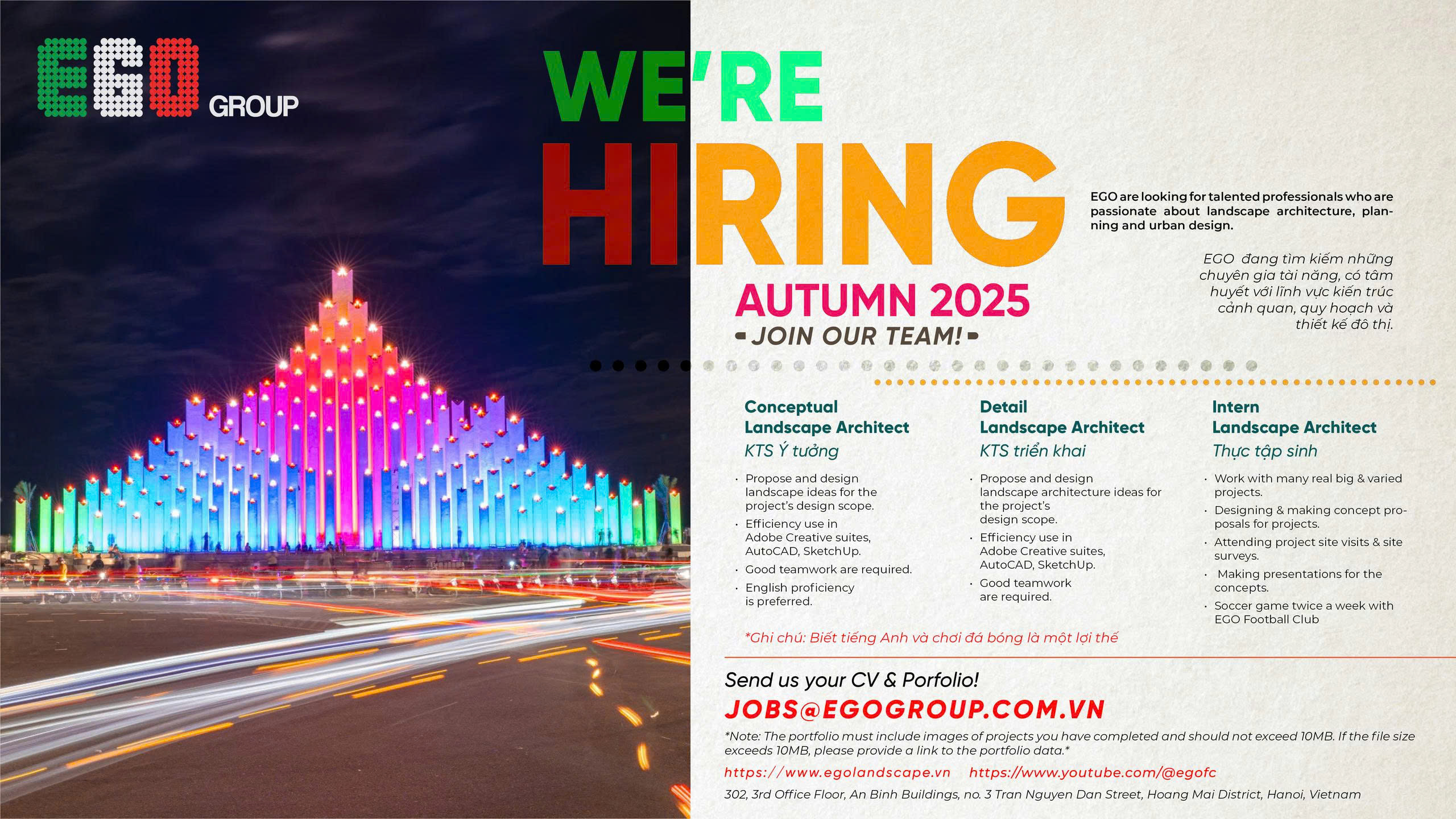 Hãy cùng chúng tôi tạo nên những dấu ấn thiết kế đầy cảm hứng và bền vững! EGO Group tìm kiếm những ứng viên đam mê, nhiệt huyết, sẵn sàng trở thành những người tiên phong trong lĩnh vực kiến trúc cảnh quan — những người luôn tư duy phản biện, sáng tạo và không ngừng học hỏi. Nếu bạn khao khát được đóng góp vào các dự án ý nghĩa, tôn vinh văn hóa, thiên nhiên và cộng đồng, EGO rất hân hạnh chào đón bạn vào đội ngũ của chúng tôi.