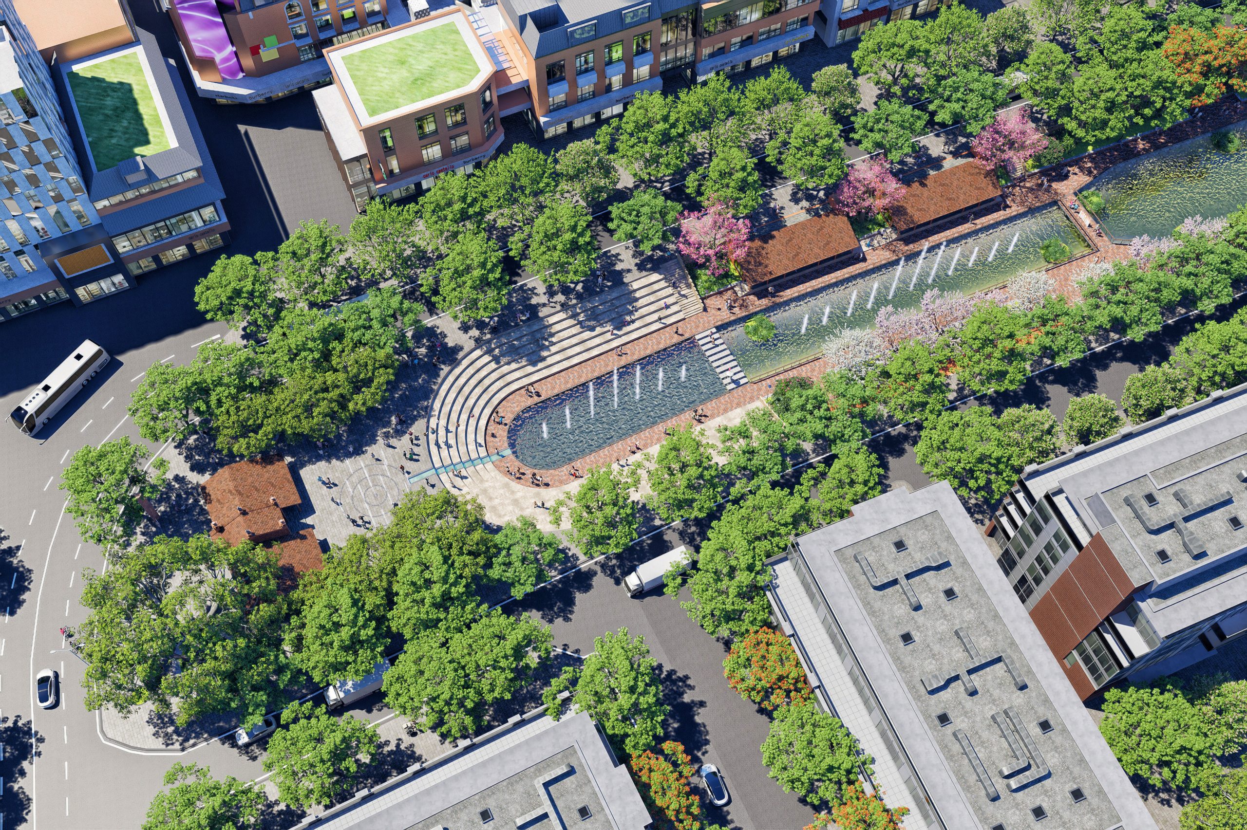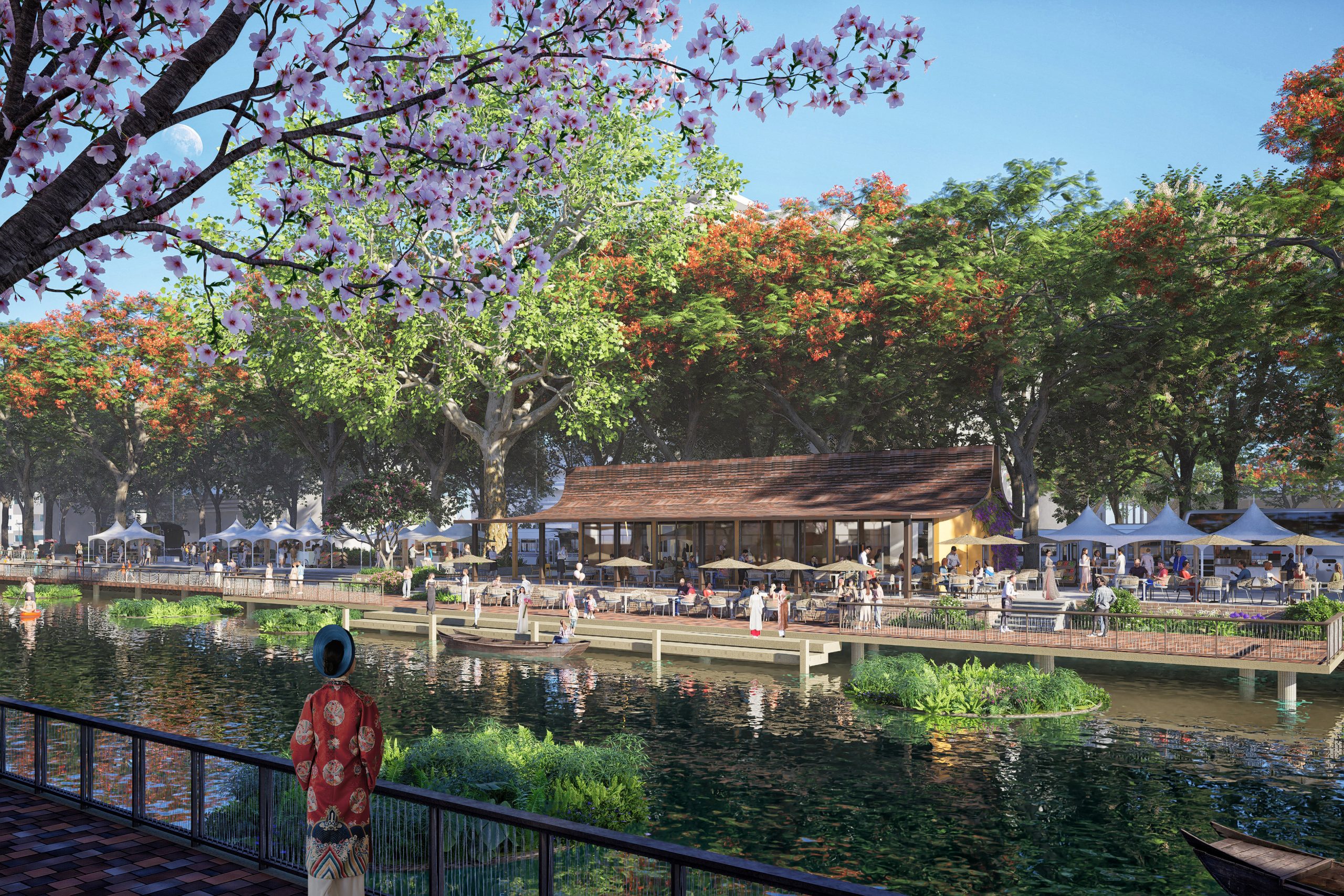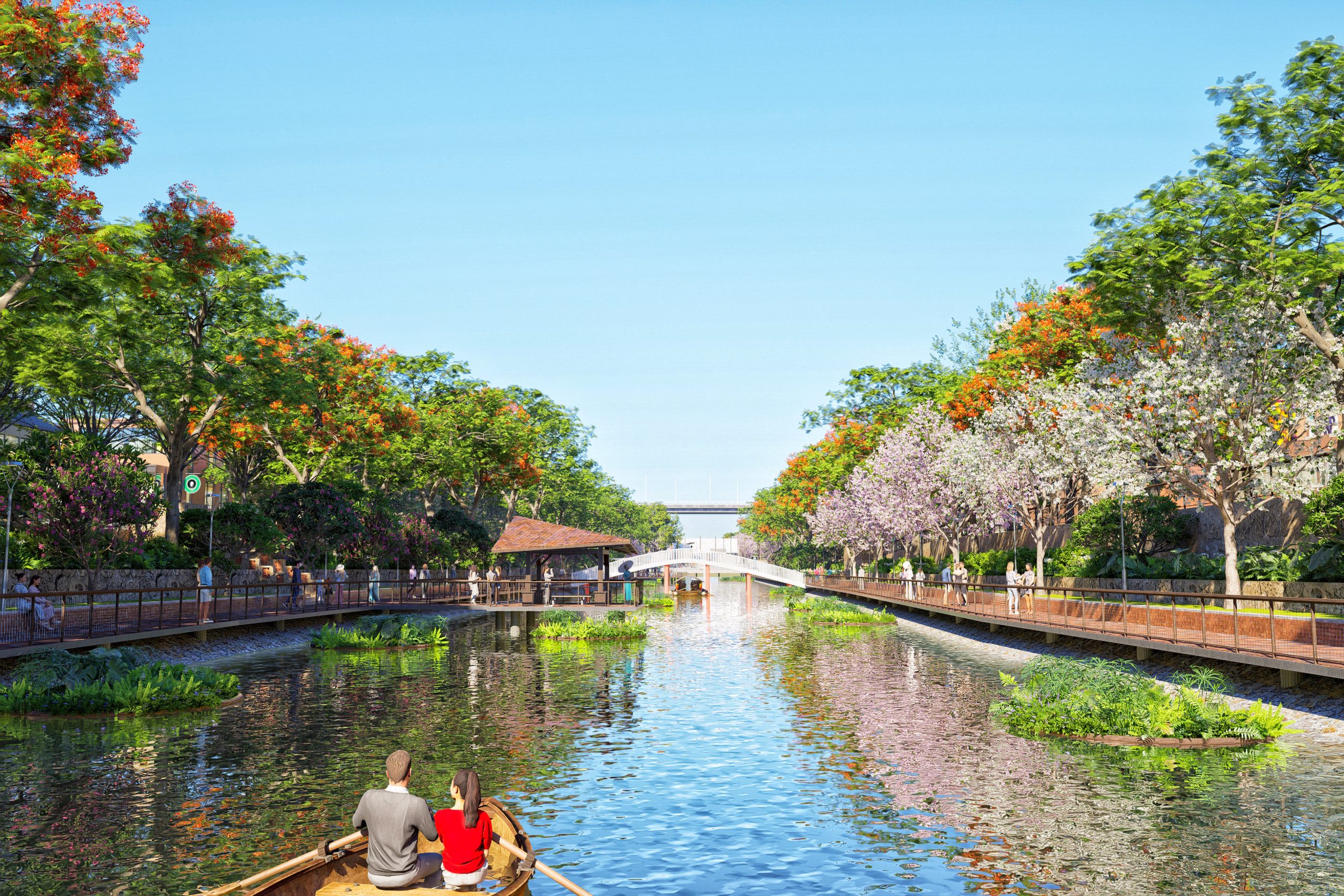The design perspective is expected on both sides of the To Lich river with full greenery along the river, elevated walking paths, and walking space adjacent to the water surface.