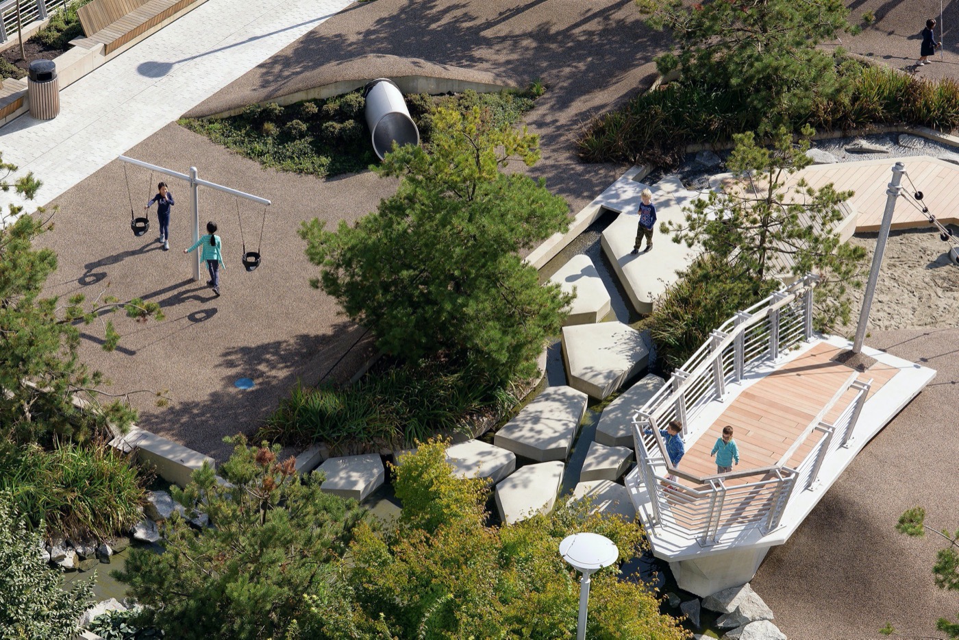 Thiết kế của công viên lấy cảm hứng từ cảnh quan ven sông địa phương của Đồng bằng sông Fraser, cũng như các yếu tố văn hóa và lịch sử từ cộng đồng. Các yếu tố của khu vườn bao gồm một loạt các hòn đảo được bao quanh bởi mặt nước và một gian hàng đương đại được thiết kế để tái hiện lại các quán trà truyền thống của châu Á. Các hình thức của cảnh quan Richmond được phản ánh trong các đặc điểm nước uốn lượn và không gian mở xanh tươi. Nước len lỏi khắp công viên và kết nối các không gian và là điểm hoạt động đa dạng thông qua một loạt các hồ nước phản chiếu yên tĩnh và những dòng suối uốn khúc. Công viên ôm trọn di sản châu Á đa dạng của Richmond với những lùm cây Anh đào nở hoa. Tháp phun nước trong sân chơi của trẻ em là một nét trừu tượng của một ngôi chùa truyền thống. Ngành đánh cá lịch sử của Richmond được phản ánh trong một yếu tố trò chơi trừu tượng bao gồm một chiếc thuyền đánh cá được sử dụng như một đài ngắm cảnh và kích thích hoạt động leo núi của trẻ.