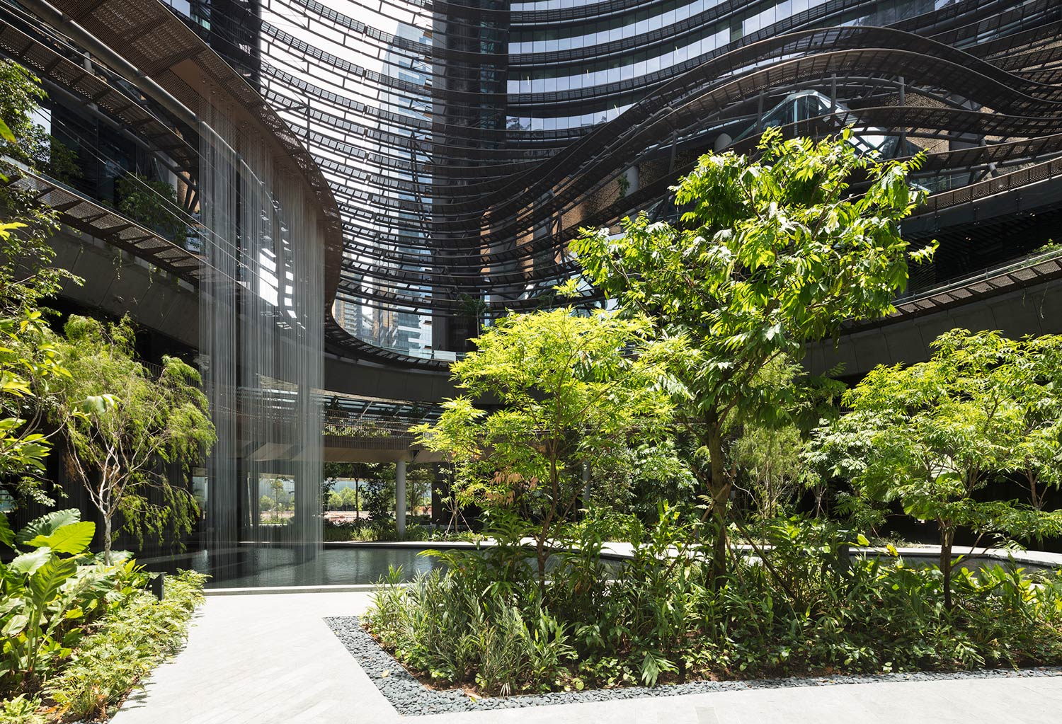 Được coi là một trong những khu vực công trình có cảnh quan rộng lớn nhất ở Vịnh Marina, Green Heart tạo ra một không gian công cộng đầy cảm hứng và đa chức năng. Khách thăm quan có thể vào thăm khu vườn trung tâm từ bốn lối vào ở tầng trệt. Một bể cảnh lớn dùng phản chiếu lớn phản ánh bầu trời và một thác nước ba tầng tạo trên mặt đứng công trình. Vườn được kết nối bằng những con đường giao nhau, trong khi đó 240 cây bóng mát lớn được trồng bên dưới những tấm kính lợp bóng láng của tòa nhà kéo dài đến quảng trường trung tâm. Một đoạn đường dốc chạy quanh co và kết nối các tầng của tòa nhà. Những dòng nước và ánh sáng rơi từ trên xuống và tiếng động khi nước rơi xuống bể tạo nên cảm giác vô cùng thú vị. Du khách và cư dân có thể tận hưởng cảm giác giống như vượt lên trời phía trên thảm thực vật nhiệt đới, trải nghiệm những thay đổi về khí hậu ở các mức độ khác nhau, giống như trong thung lũng rừng nhiệt đới: Từ Trái tim Xanh, qua Cloud Garden, lên đỉnh núi.